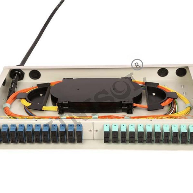 This 1U Rack Mount Patch Panel comes pre-loaded with splice trays and a variety of adapter ports like SC,ST,FC and LC. It facilitates the splicing and termination of fiber optic cables (OFC) and pigtails in a fiber access network, making fiber optic communication installation and troubleshooting faster, easier, and more cost-effective.