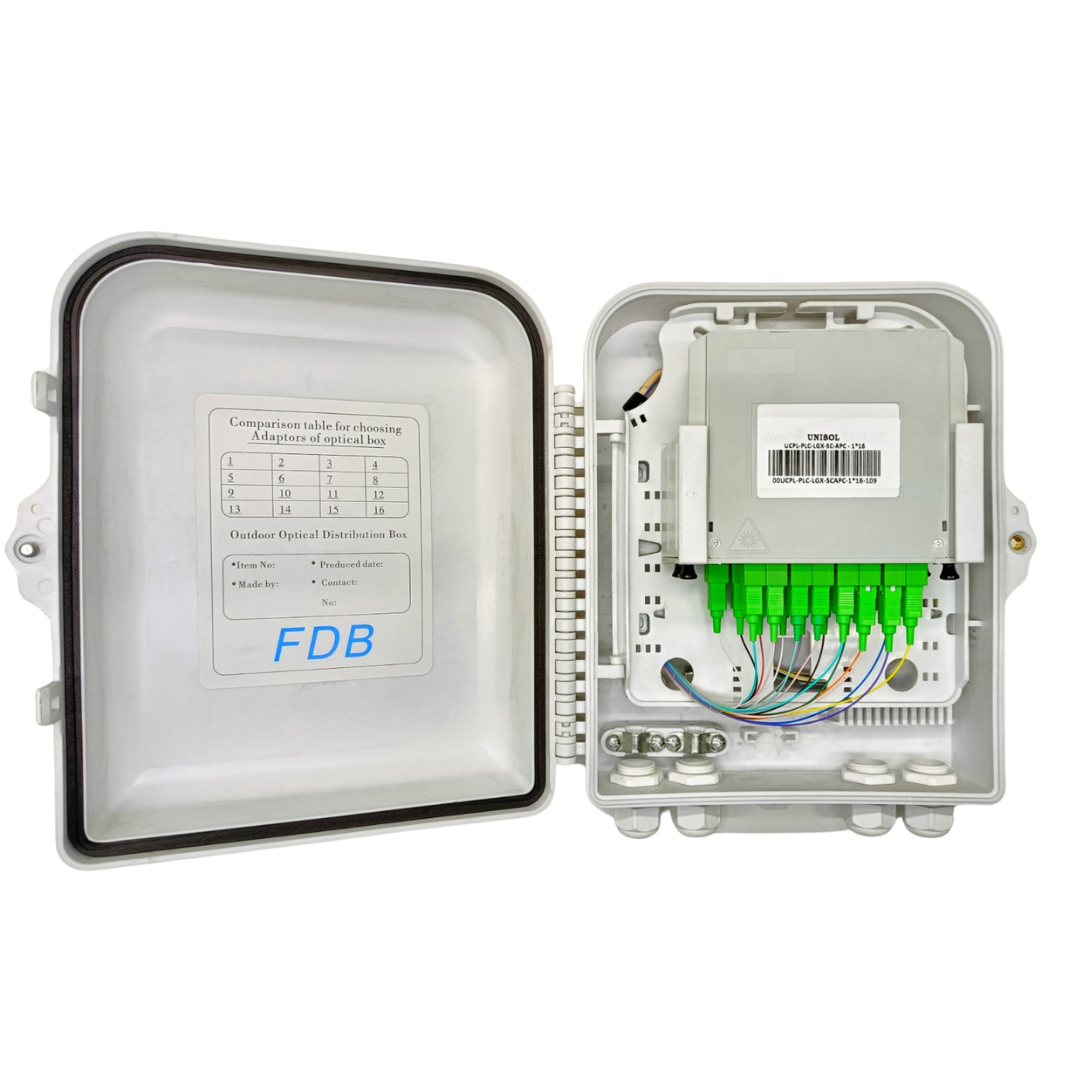 Unisol Wall Mount Optical Fiber Distribution Box (FDB) is an advanced, compact, and highly efficient solution engineered to support secure fiber optic terminations within FTTH and FTTx communication networks. Built to meet the rising demand for high-speed connectivity, this optical fiber distribution box is designed to streamline cable management and ensure optimal network performance in both residential and commercial environments.